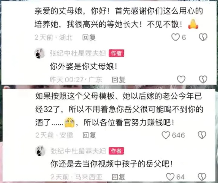 10月初,74岁的张纪中发布为1岁女儿“小龙珠”庆生的视频,却引发了网络暴力。不少网友在评论区留言“求娶”,相关留言随后被张纪中怒怼。其中有网友表示“我要做你女婿”,张纪中回应“你还是做你爹和你外公女婿吧”,网友称其妻子为“丈母娘”,张纪中怒怼“你外婆是你丈母娘”。
